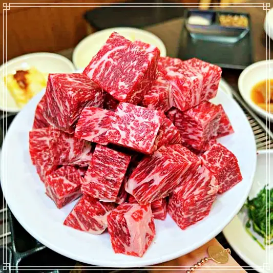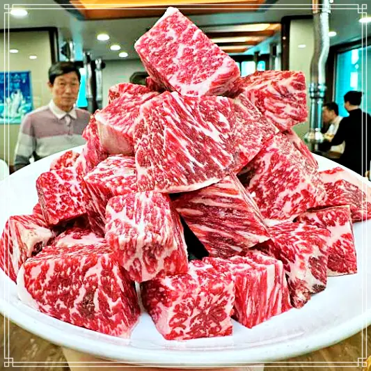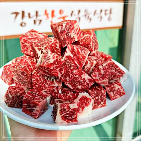 지난번에 먹은 마늘숙성한우이 너무 맛있어서 오늘은 갈비살, 꽃등심를 시식하러 갔습니다. 생방송투데이 방송에서 소개된 맛의승부사 본고장 맛 30년 노포 강남한우식육식당이 괜히 있는 게 아니네요! 마늘숙성한우은 물론이고, 함께 간 분들 모두가 맛있게 먹었다는 평가를 하셨습니다. 이번에 먹은 갈비살, 꽃등심도 맛있었는데, 특히나 그들의 손맛이 일품이었습니다.